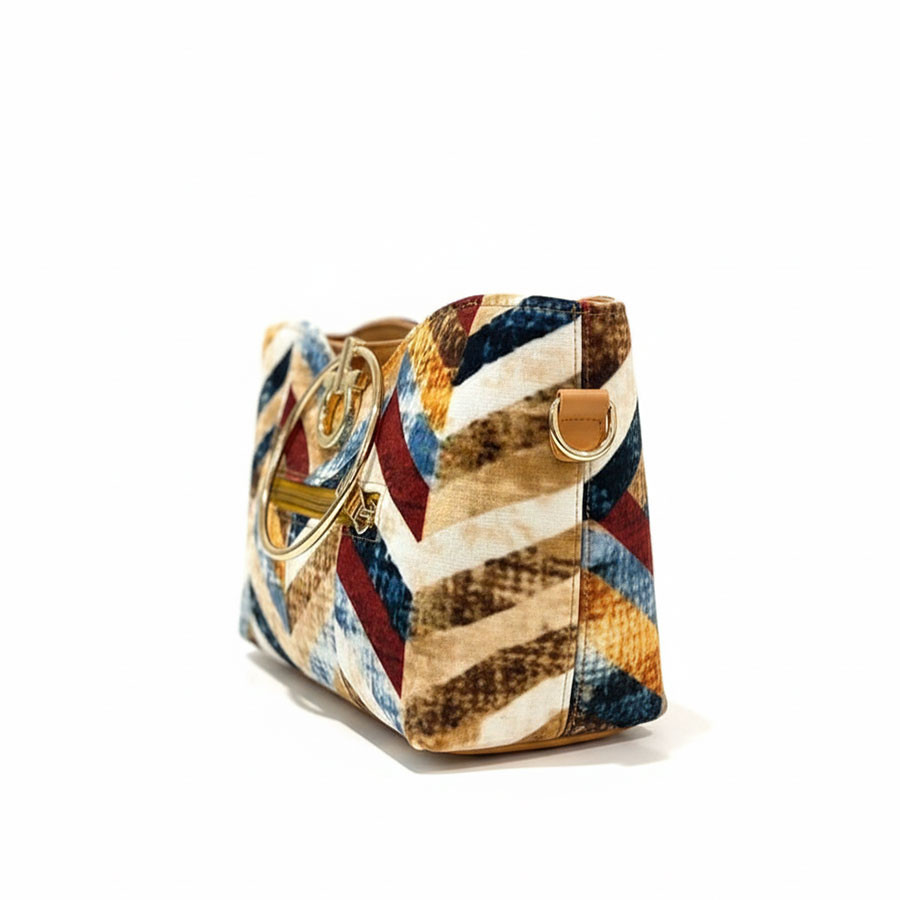 distinctive chevron patterned fabric with metallic ring handles for elegant