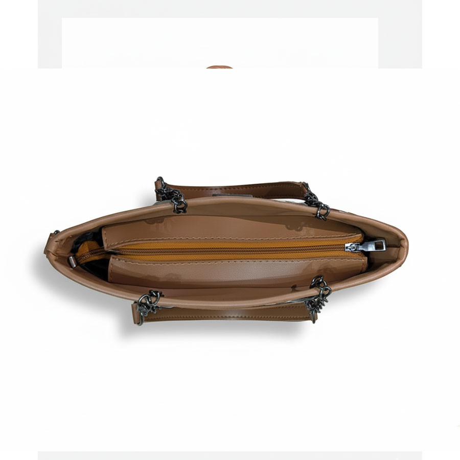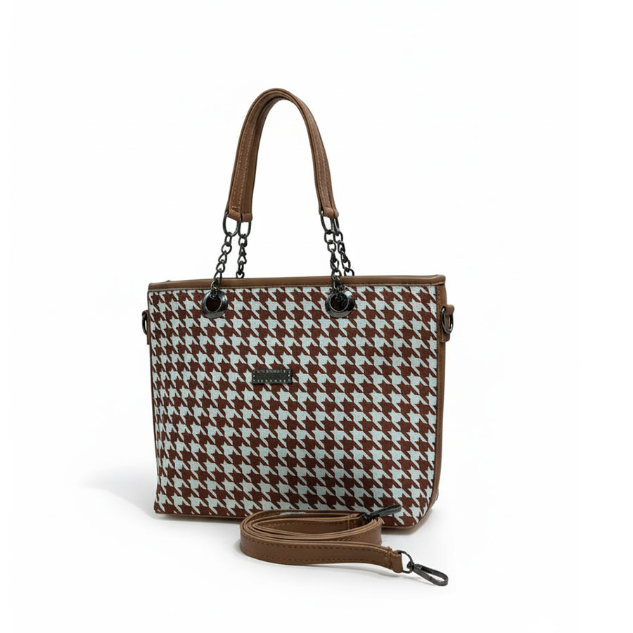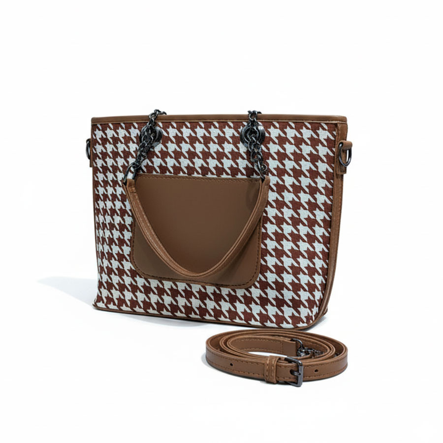 Discover the perfect blend of style and functionality with the Brown Chain Tote. Crafted for the modern, fashion-conscious woman, this tote features a timeless classic pattern that adds a touch of sophistication to any outfit. The sleek chain handles provide a chic, contemporary edge, while the spacious interior ensures you can carry all your essentials comfortably. Whether for daily errands, work, or special occasions, this tote effortlessly complements your look, offering luxury, versatility, and practicality in one refined accessory. Elevate your wardrobe with a bag that’s as elegant as it is functional.