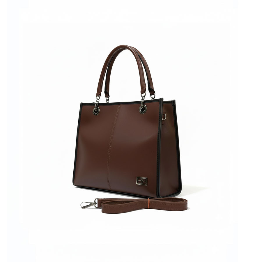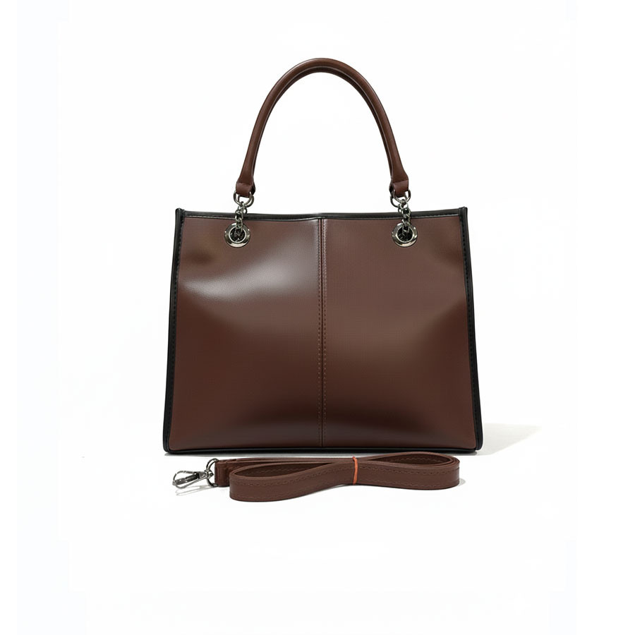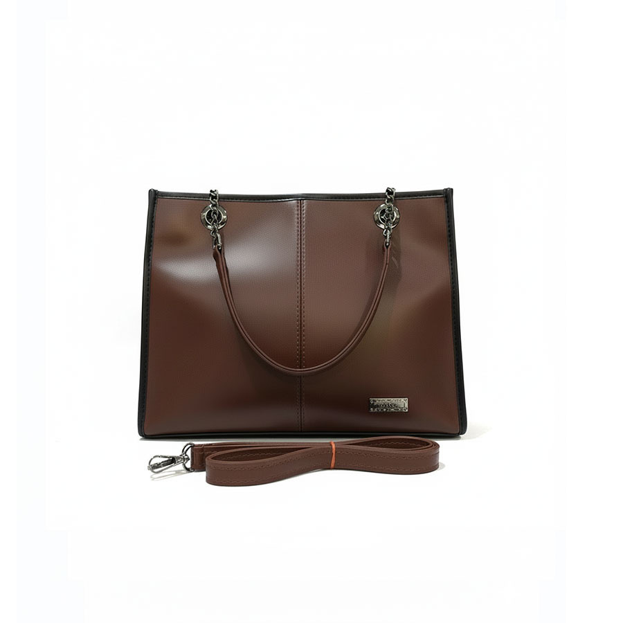 Sophisticated ladies tote featuring smooth leather-look material with elegant contrast stitching. This premium handbag showcases exceptional craftsmanship with both stylish chain straps and comfortable carry handles. The sleek silhouette offers versatile appeal for both casual and professional settings. Adorned with a discrete metallic brand plate for subtle elegance. Perfect for the modern woman seeking both functionality and style in a spacious everyday accessory that complements any outfit.