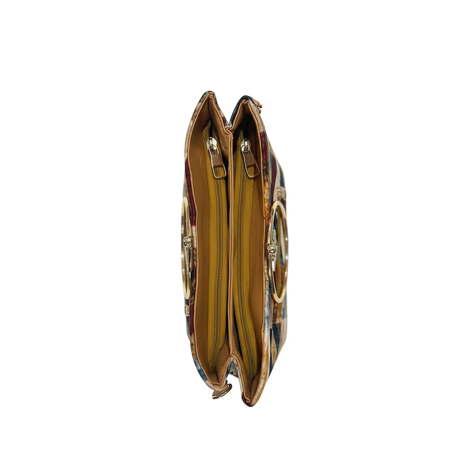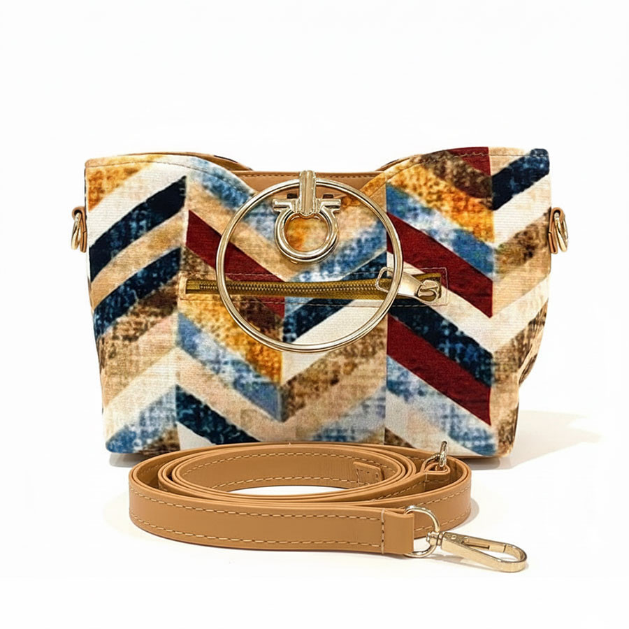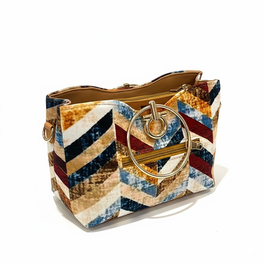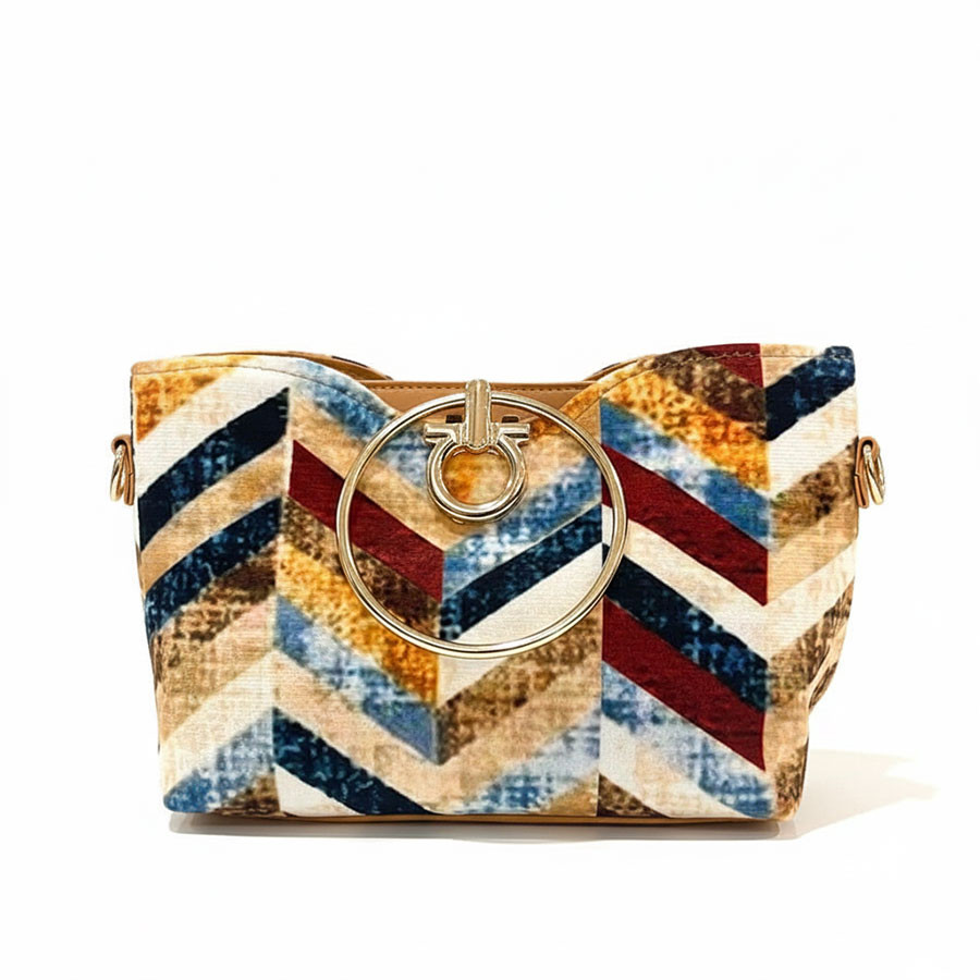 distinctive chevron patterned fabric with metallic ring handles for elegant